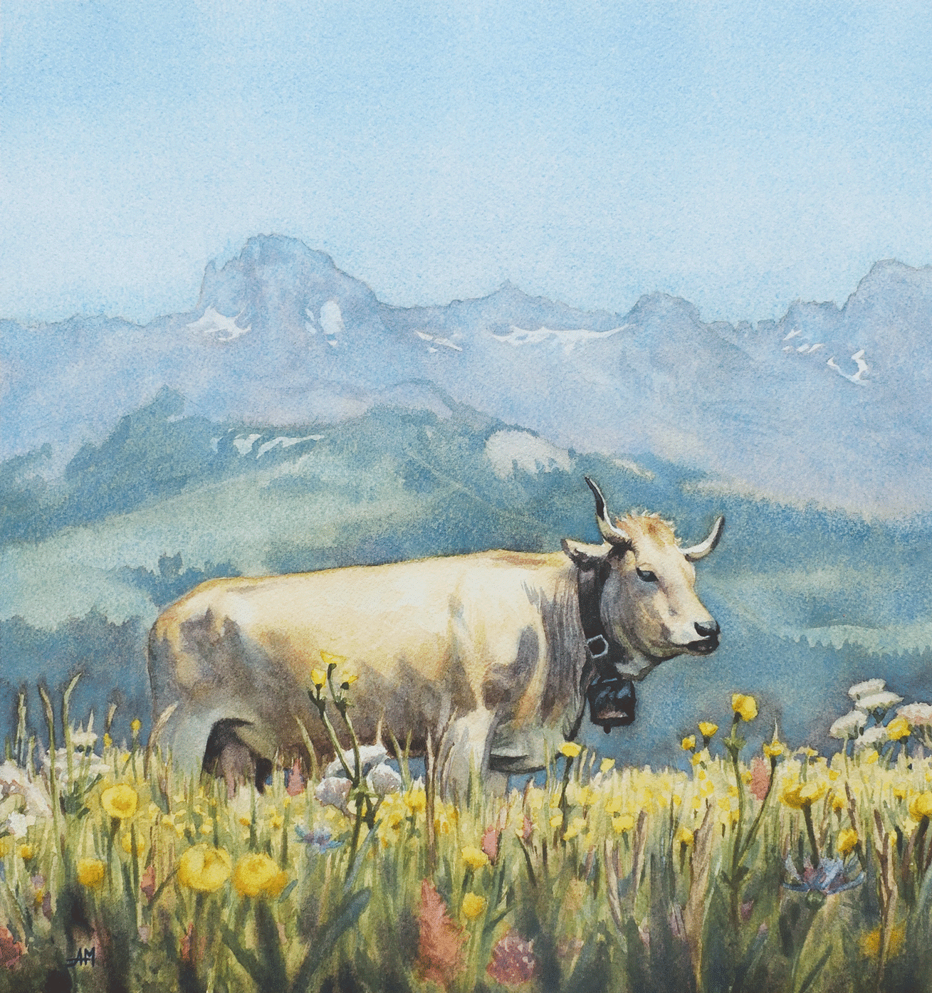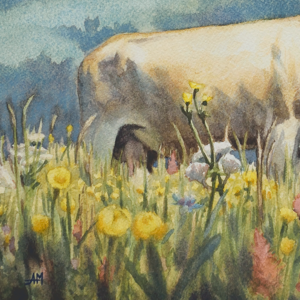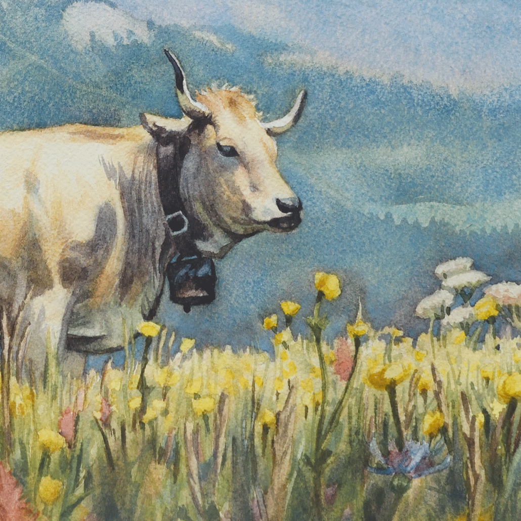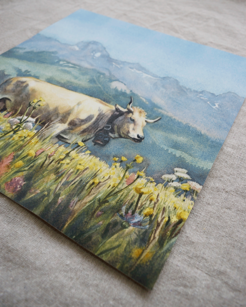 Cette aquarelle t’emmène vivre un instant de douceur en bonne compagnie. Pensée pour ressentir l’air pur d’une journée ensoleillée en altitude, elle met à l’honneur les vaches, les élevages bovins étant une présence indissociable de ce milieu si riche et unique.